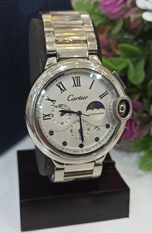 ساعت مچی مردانه سه موتور فعال کرنوگراف بند نقره ای صفحه سفید برند کارتیر CARTIER،تکی به قیمت عمده
