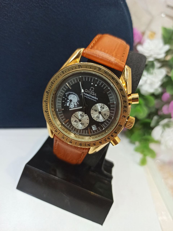 ساعت مچی مردانه سه موتور فعال کرنوگراف بند نارنجی صفحه مشکی برند اُمگا OMEGA،تکی به قیمت عمده