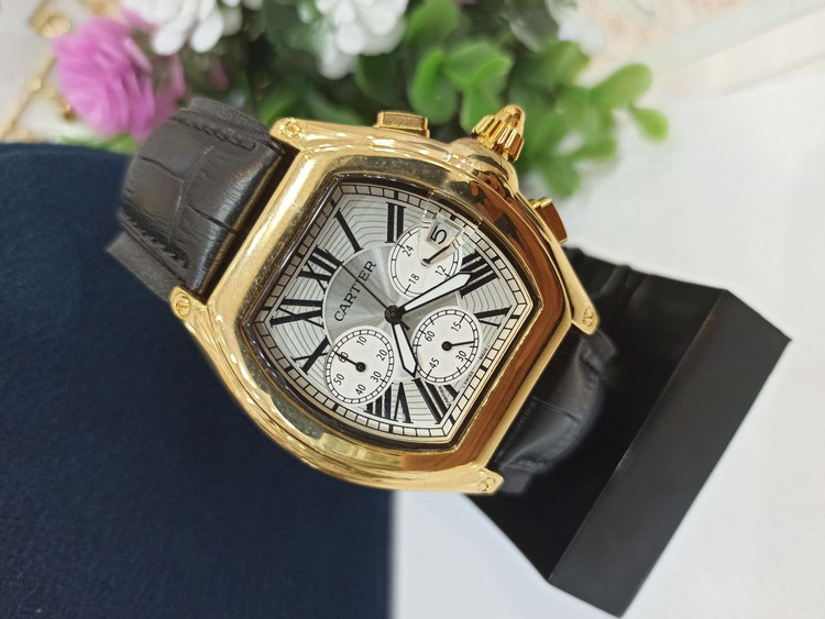 ساعت مچی مردانه سه موتور فعال کرنوگراف بند مشکی صفحه سفید دور طلایی برند کارتیر CARTIER،تکی به قیمت عمده