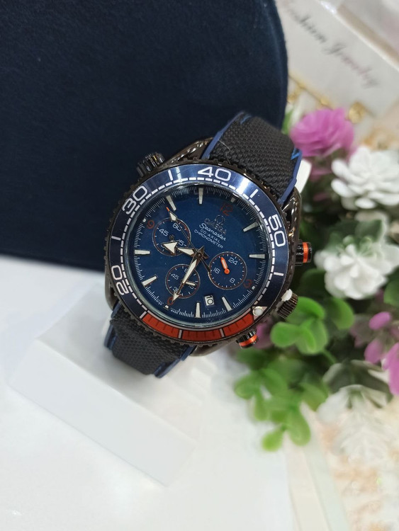ساعت مچی مردانه سه موتور فعال کرنوگراف بند مشکی صفحه سورمه ای برند اُمگا OMEGA،تکی به قیمت عمده
