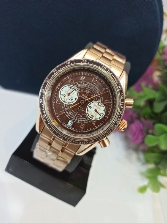 ساعت مچی مردانه سه موتور فعال کرنوگراف بند رزگلد صفحه قهوه ای برند اُمگا فضایی OMEGA،تکی به قیمت عمده