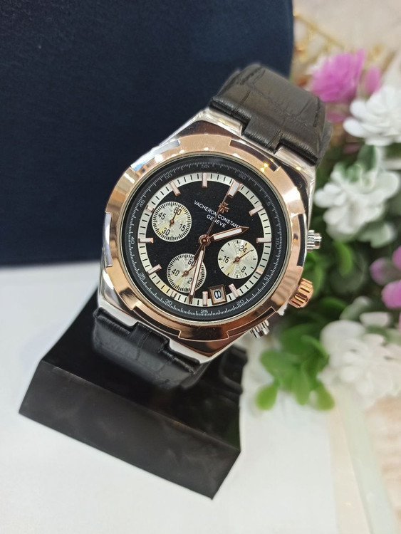 ساعت مچی مردانه سه موتور فعال کرنوگراف بند مشکی صفحه مشکی دور رزگلد برندVACHERON CONSTANT GENEVE،تکی به قیمت عمده