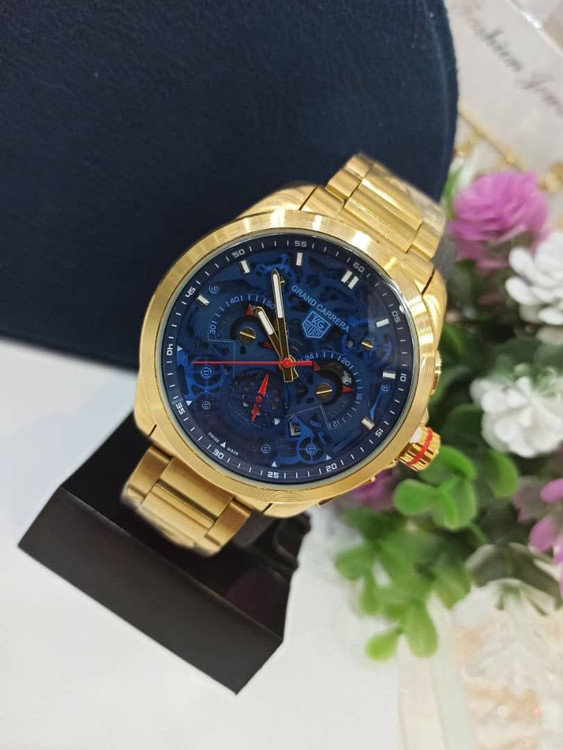 ساعت مچی مردانه سه موتور فعال کرنوگراف بند طلایی صفحه سورمه ای برند گرند کاررا تگ هویر، تکی به قیمت عمده