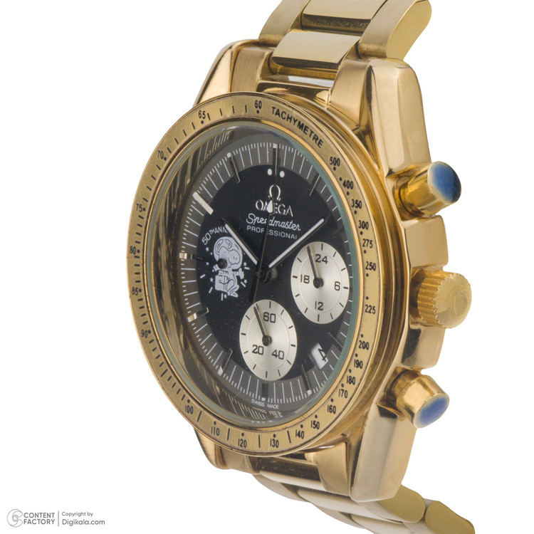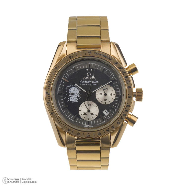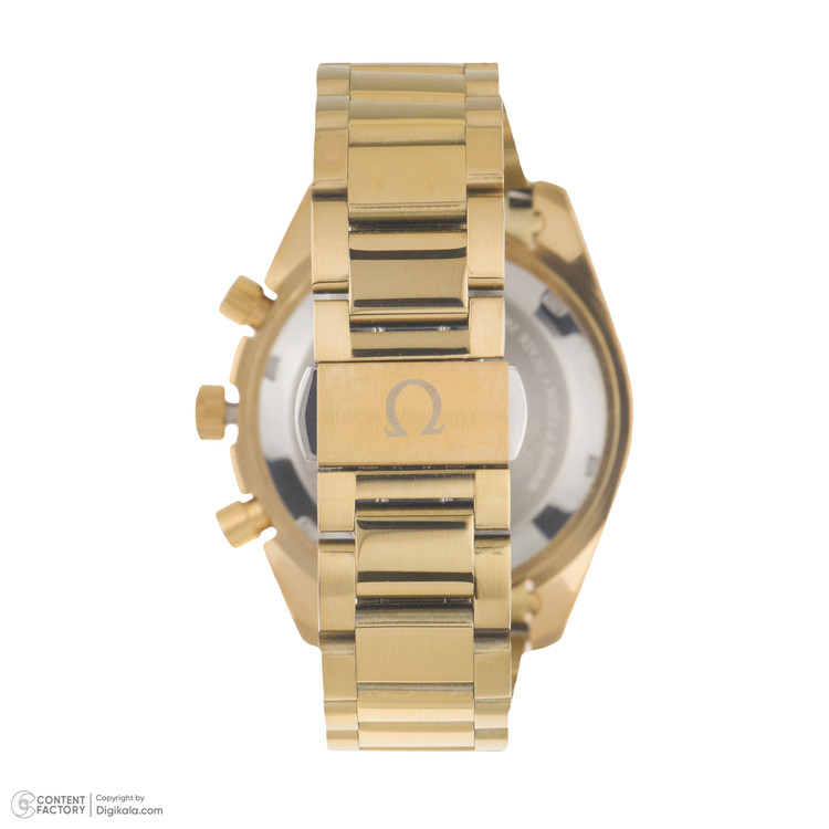 ساعت مچی مردانه سه موتور فعال کرنوگراف بند طلایی صفحه مشکی برند اُمگا فضایی OMEGA