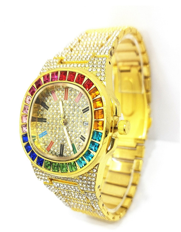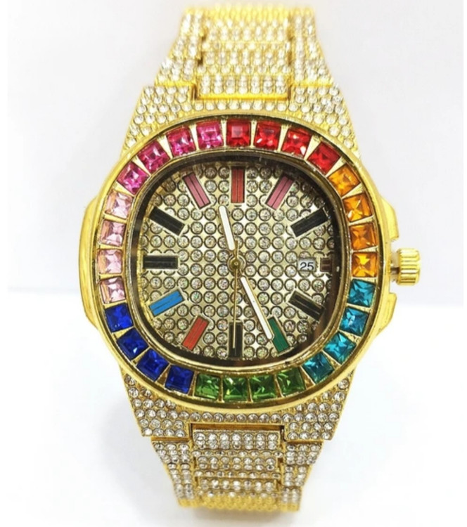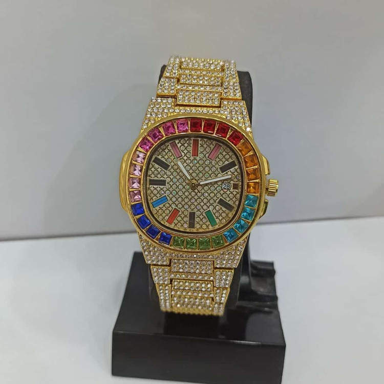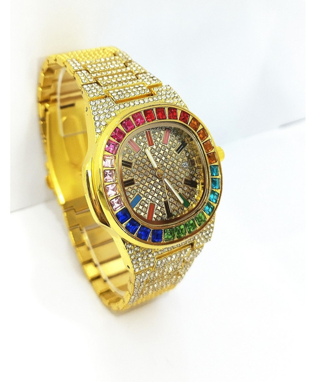 ساعت نگین دار دخترانه و پسرانه،رنگ طلایی دور نگین رنگی،دارای روزشمار