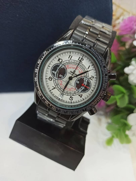 ساعت مچی مردانه سه موتور فعال کرنوگراف بند مشکی صفحه سفیدبرند اُمگا OMEGA، تکی به قیمت عمده
